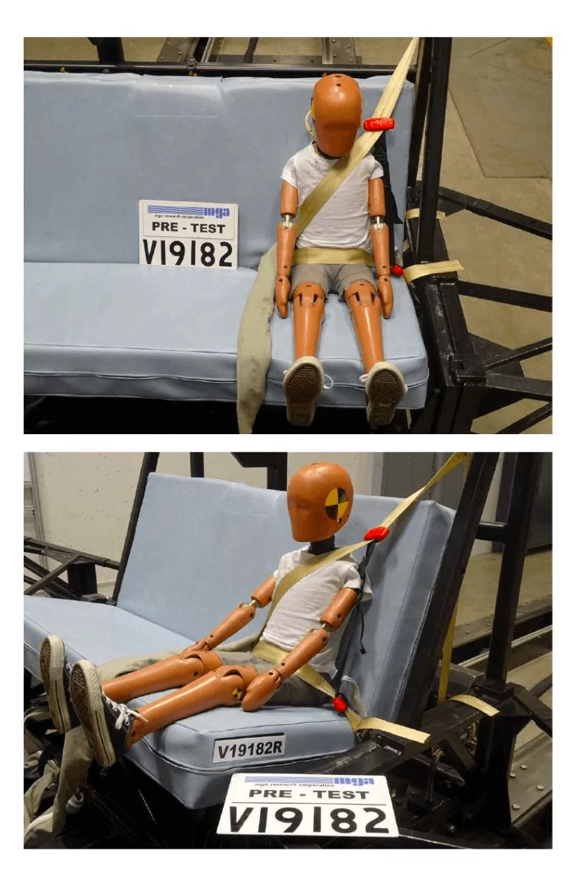 Podczas badań dynamicznych odtwarza się przebieg zderzenia czołowego na stanowisku z „sankami”. Manekin wyposażony w czujniki rejestruje przyspieszenia, siły i momenty działające m.in. na głowę, szyję, klatkę piersiową i okolice brzucha. Na tej podstawie oblicza się wskaźniki urazowości (np. HIC) oraz sprawdza przemieszczenia(głowy/kolan). Wszystkie wartości muszą mieścić się poniżej określonych limitów.