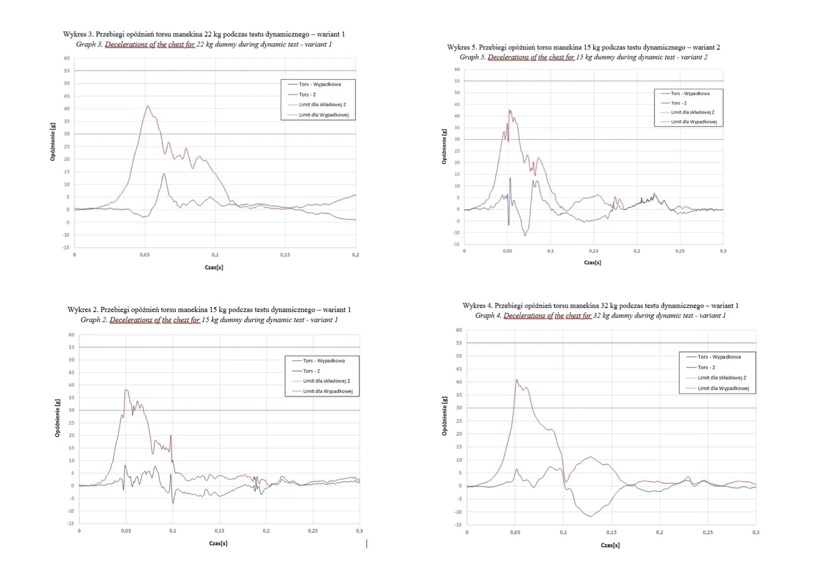 Limity przemieszczeń głowy/kolan oraz kryteria urazowości manekinów.